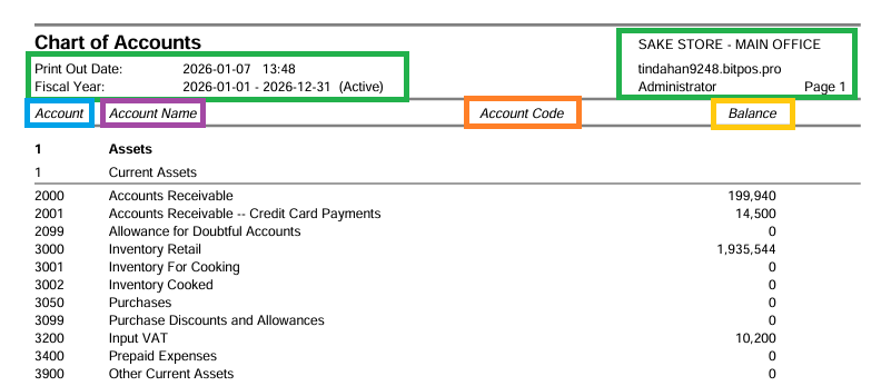 - Account – Indicates the account classification or type (e.g., Asset, Liability, Expense).
