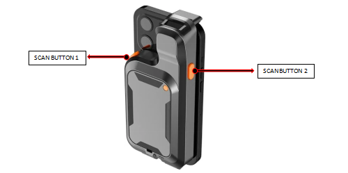 - Attach your cell phone to the Clip-Back Scanner. Then, open the Clip-Back Scanner and press and hold Button 1 or Button 2 for 3–5 seconds to power on the device.
