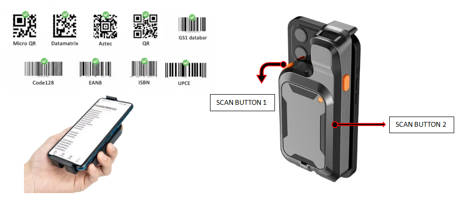 - Press Button 1 or Button 2 to scan a barcode and capture the data instantly.