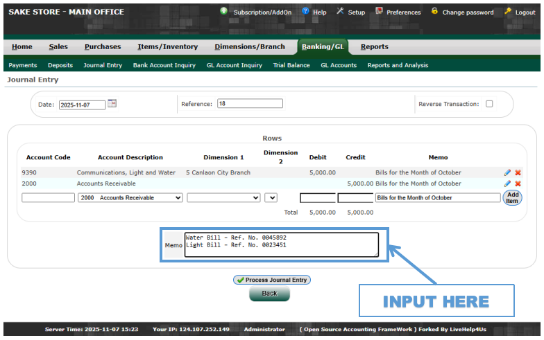 - The system will display the complete journal entry, including the debit, credit, dimension, and memo details for verification.
