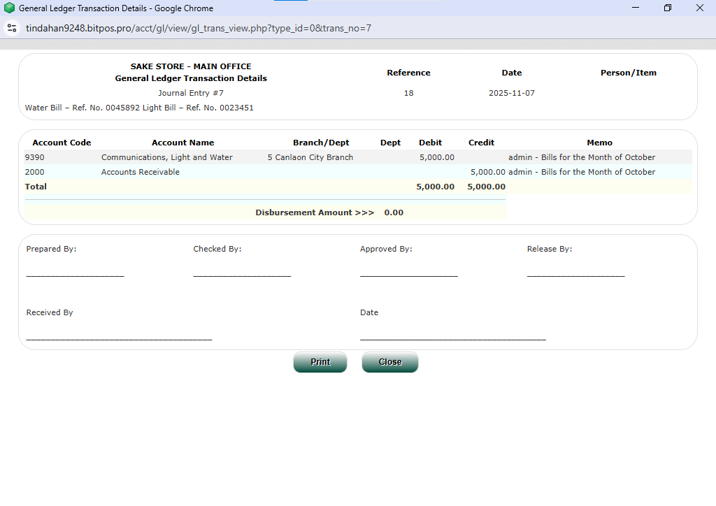 - Enter the same amount as the debit (for example, 5,000.00) in the Credit column to balance the journal entry.