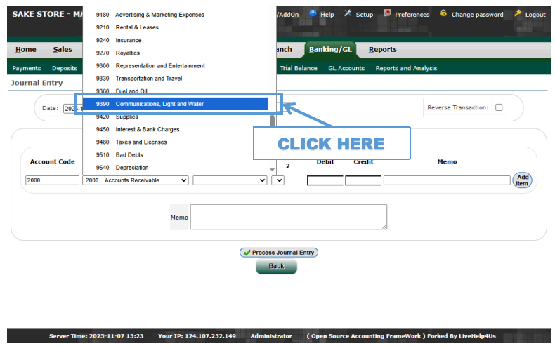 - Select the expense account where the payment will be recorded (for example, Communications, Lights, and Water).