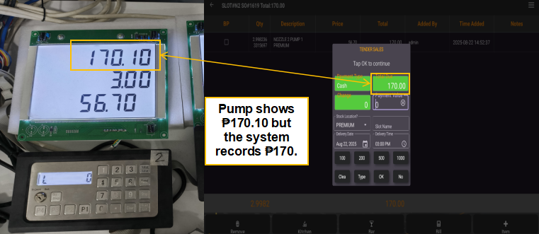 Example: Pump shows ₱283.50, System shows ₱283.50.