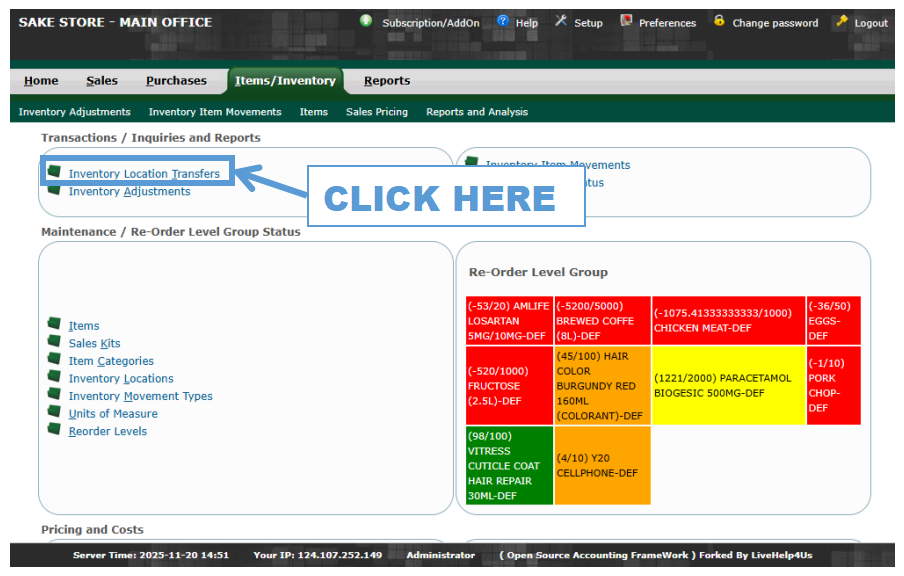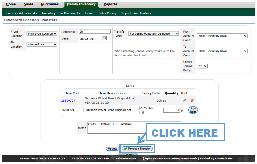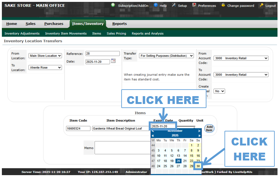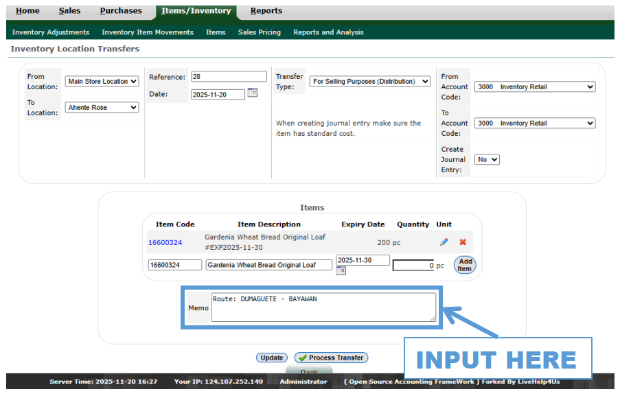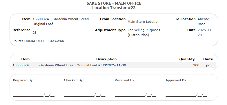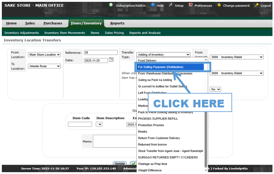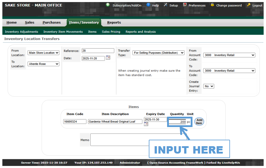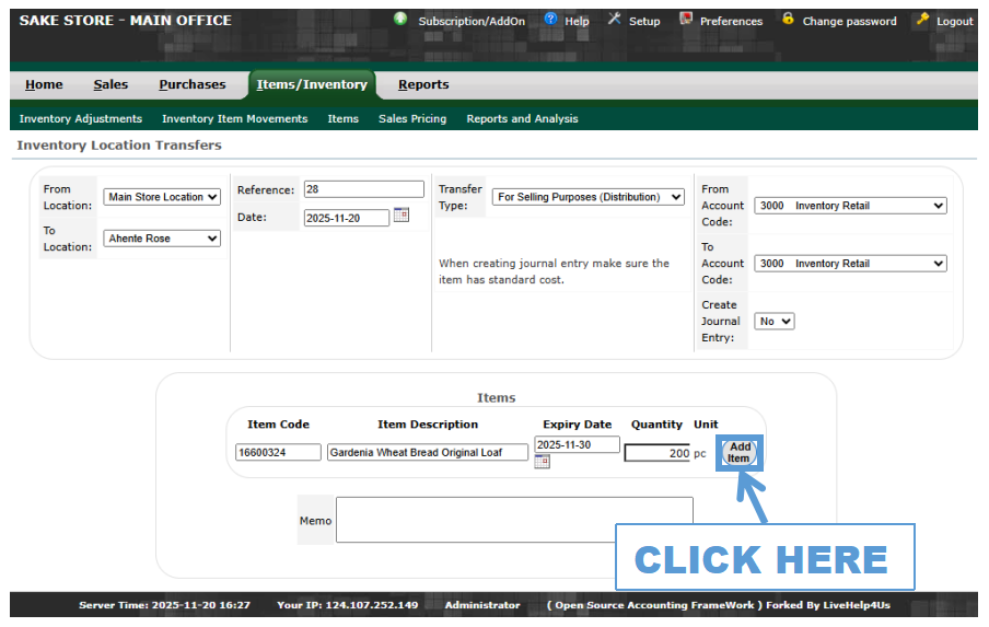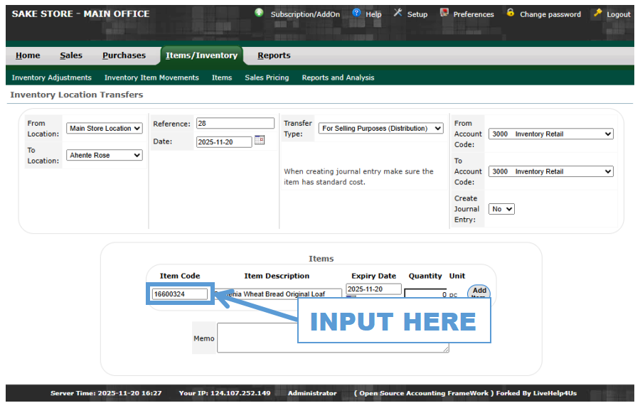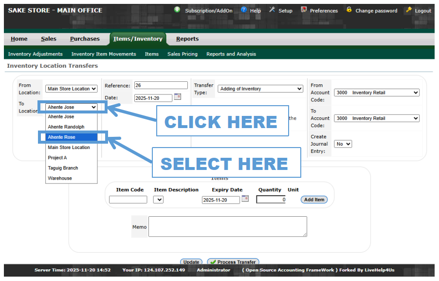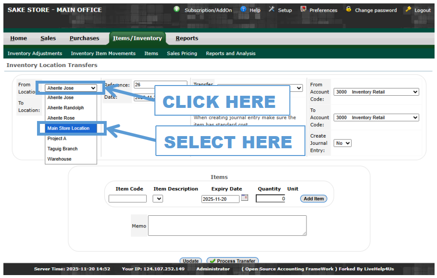 - Choose the location where the items are being taken from (e.g., Main Office).