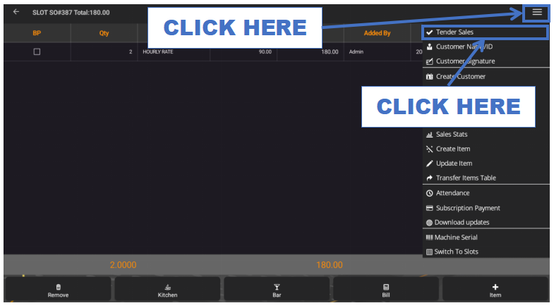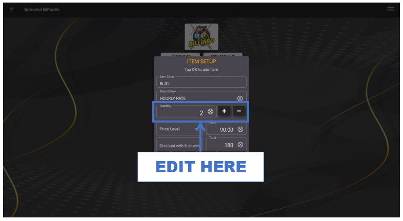 - Tap the + Item button to add an hourly billiards session.