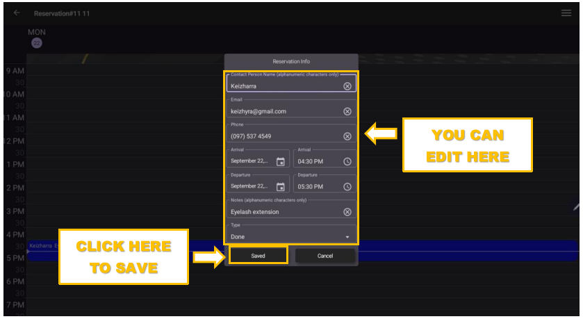 - Important Note: Always ensure the edited reservation does not clash or overlap with another existing booking before saving.