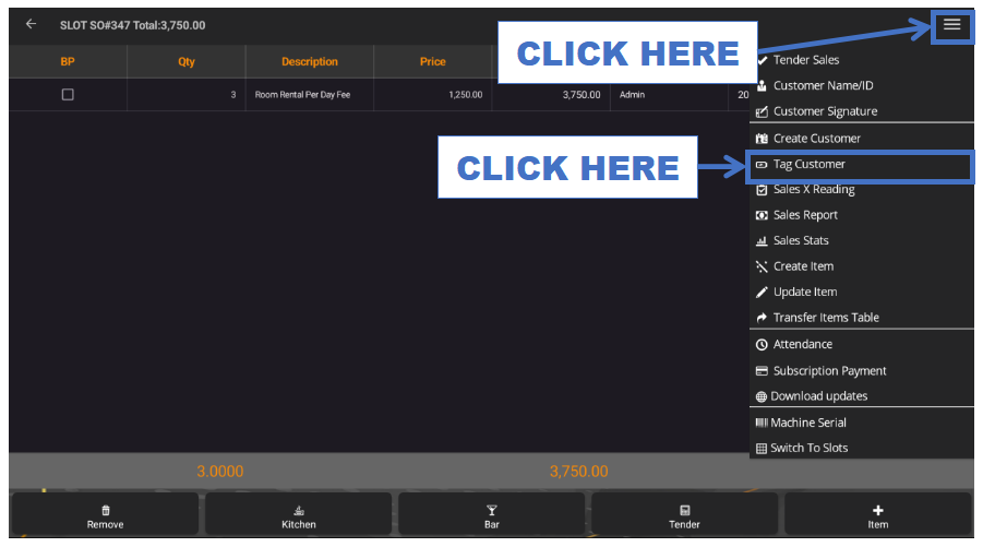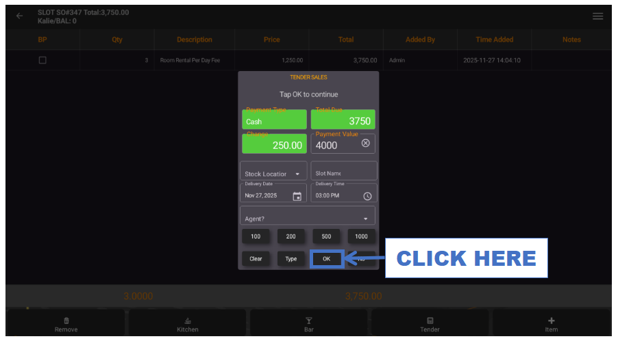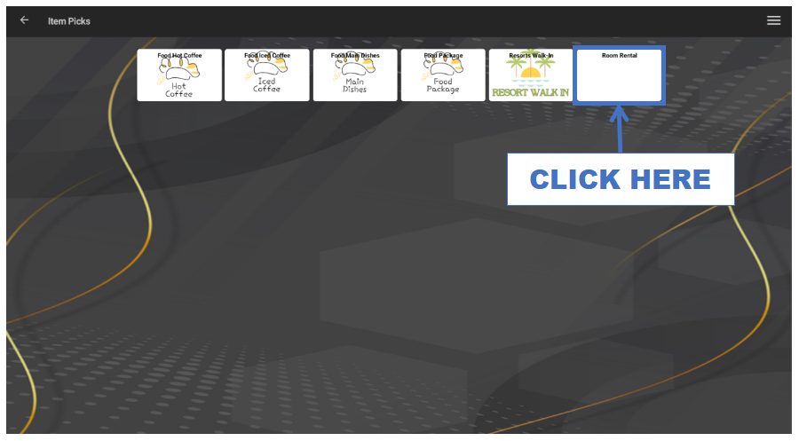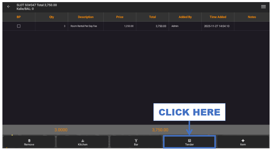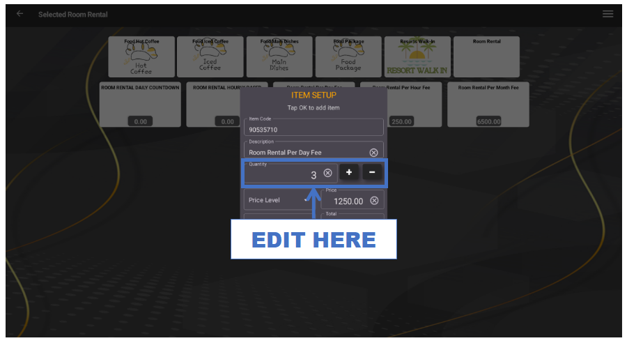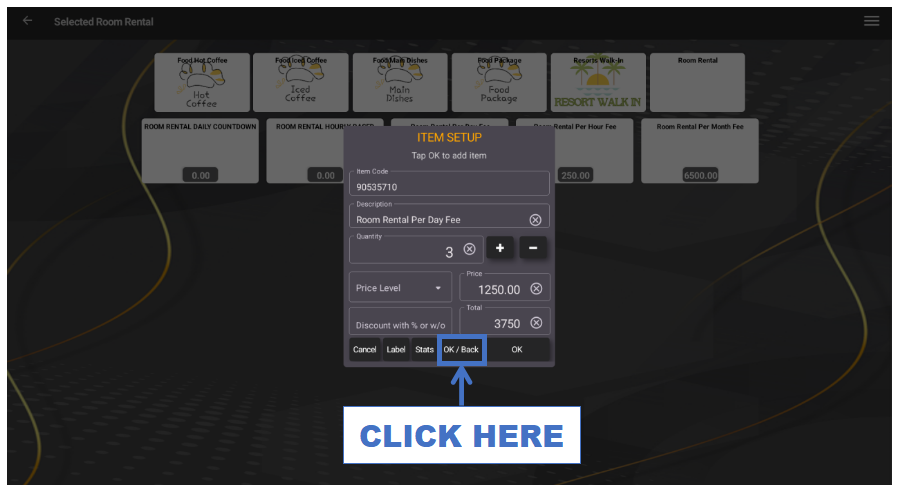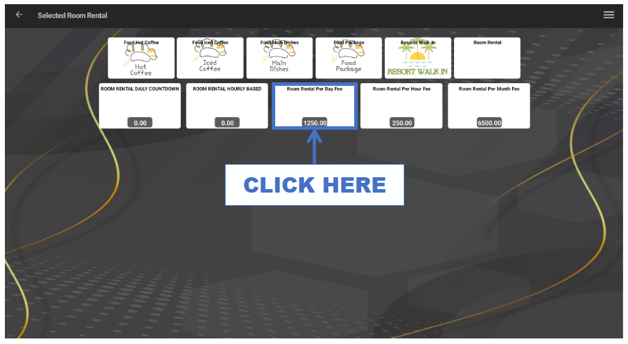 - Choose the specific item or service (e.g., Room Rental per day Fee).