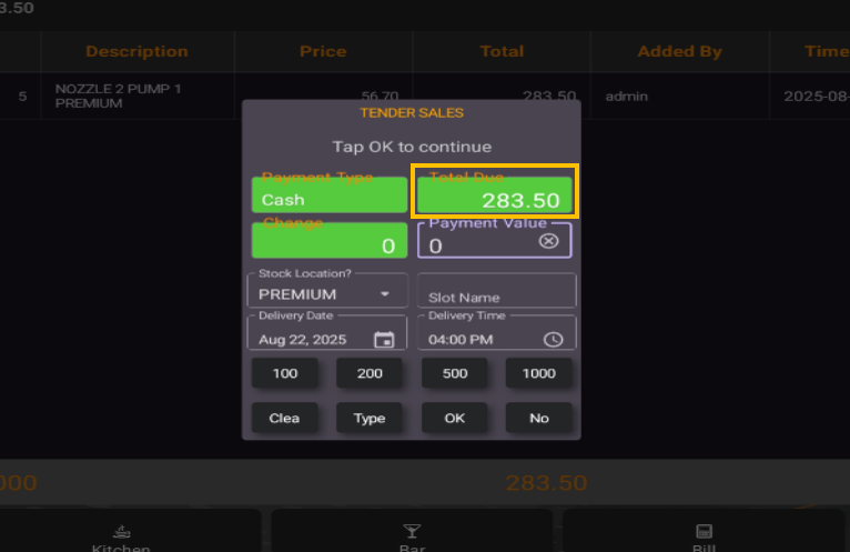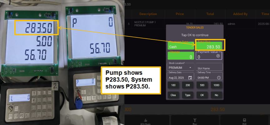 Example: Pump shows ₱283.50, System shows ₱283.50.