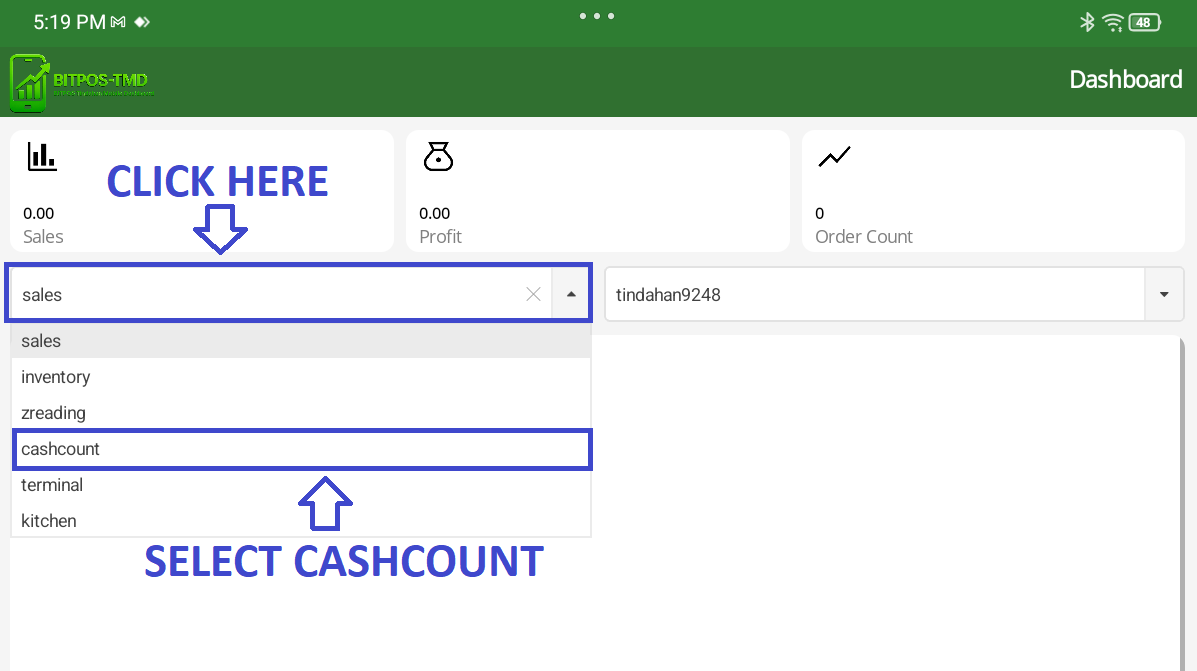 - From the dropdown menu, select Cashcount to open the Cashcount AI Chat feature.