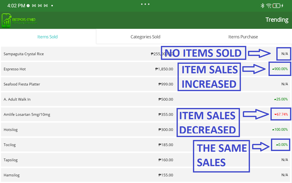 - Tap on the Trending tab located at the bottom of the dashboard to view item sales data.