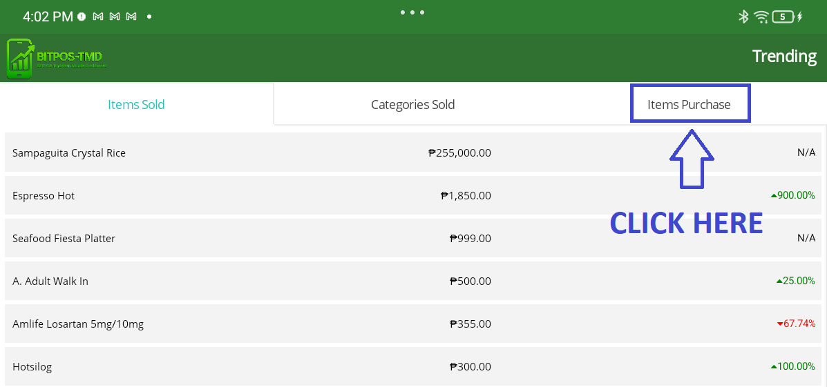 - Tap the Trending tab located at the bottom of the dashboard to view purchase analytics.