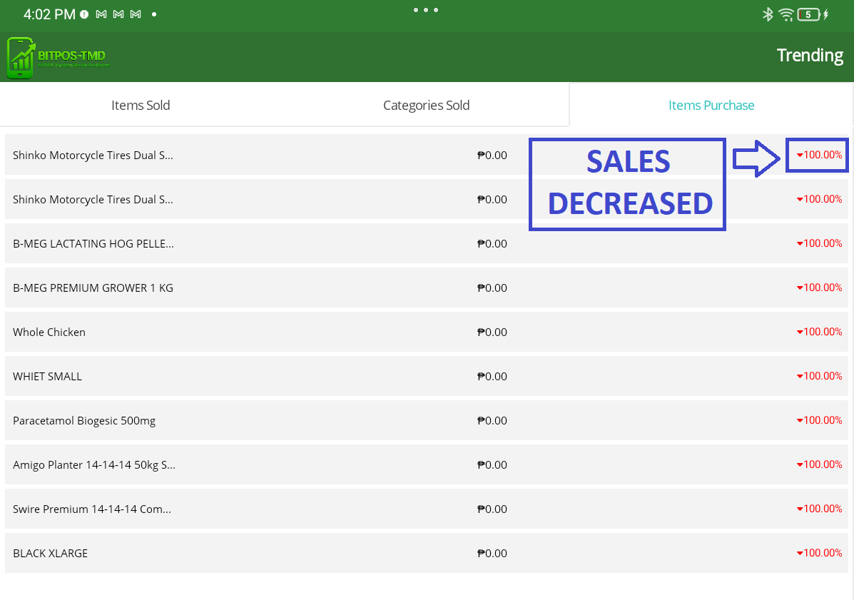 - Under Items Purchased, you can view the list of products acquired from suppliers along with their purchase trends.